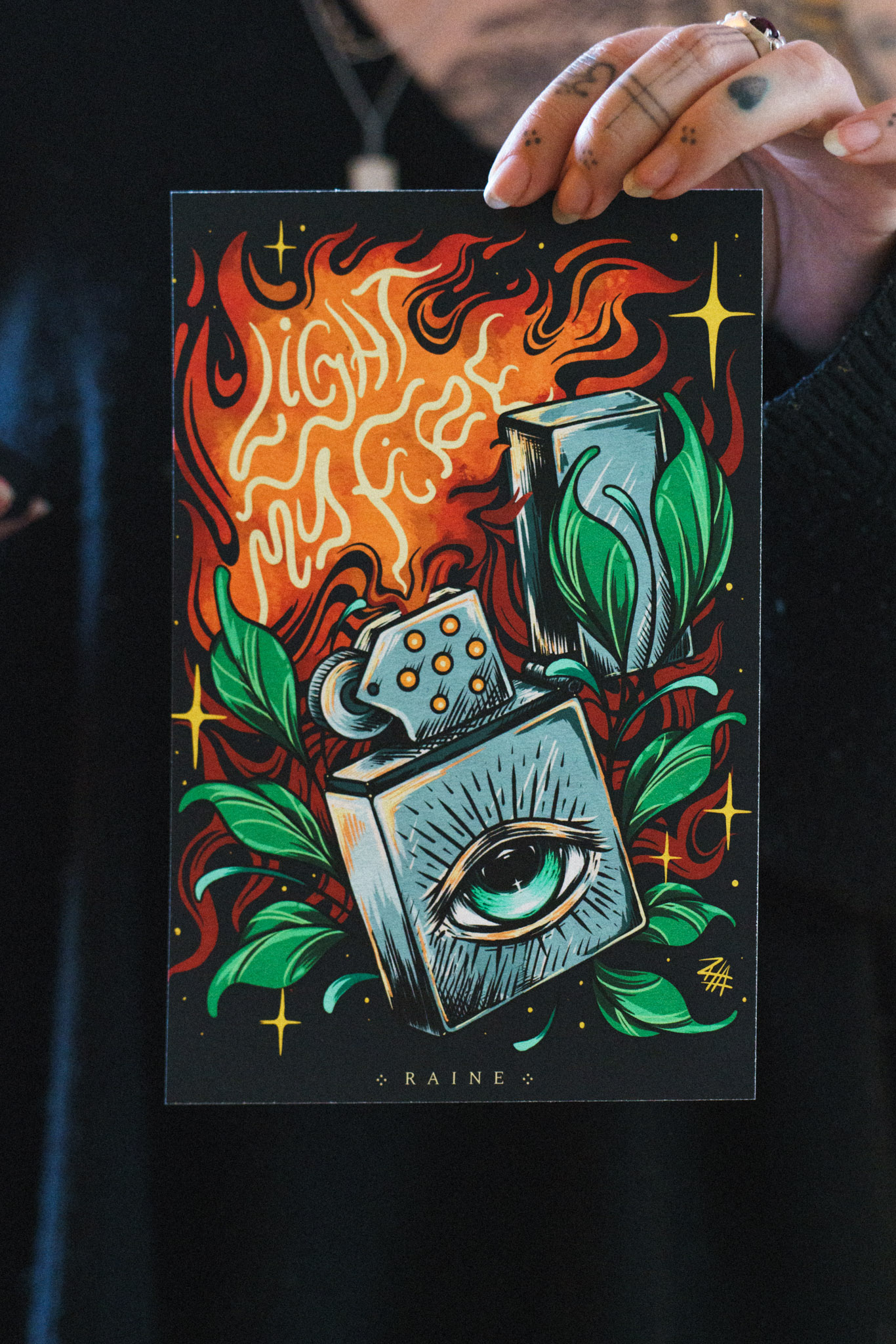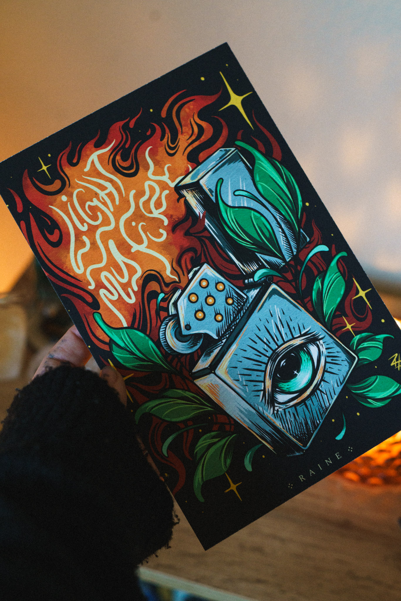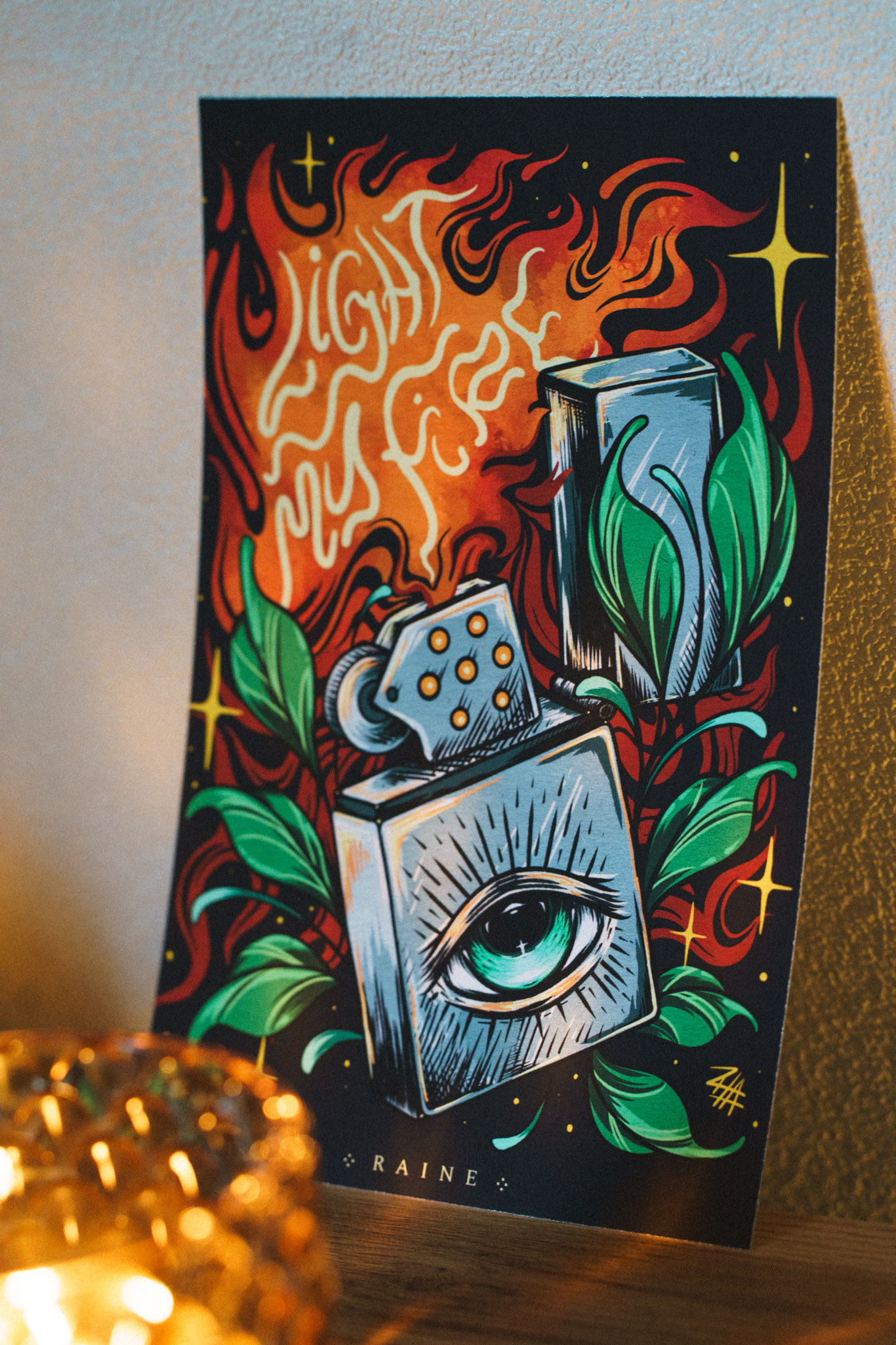 Light My Fire is an A5 fine art print featuring a surreal lighter with an all-seeing eye, wrapped in lush green leaves, with flames rising into cosmic patterns spelling out Light My Fire. From the Heart-led society collection.