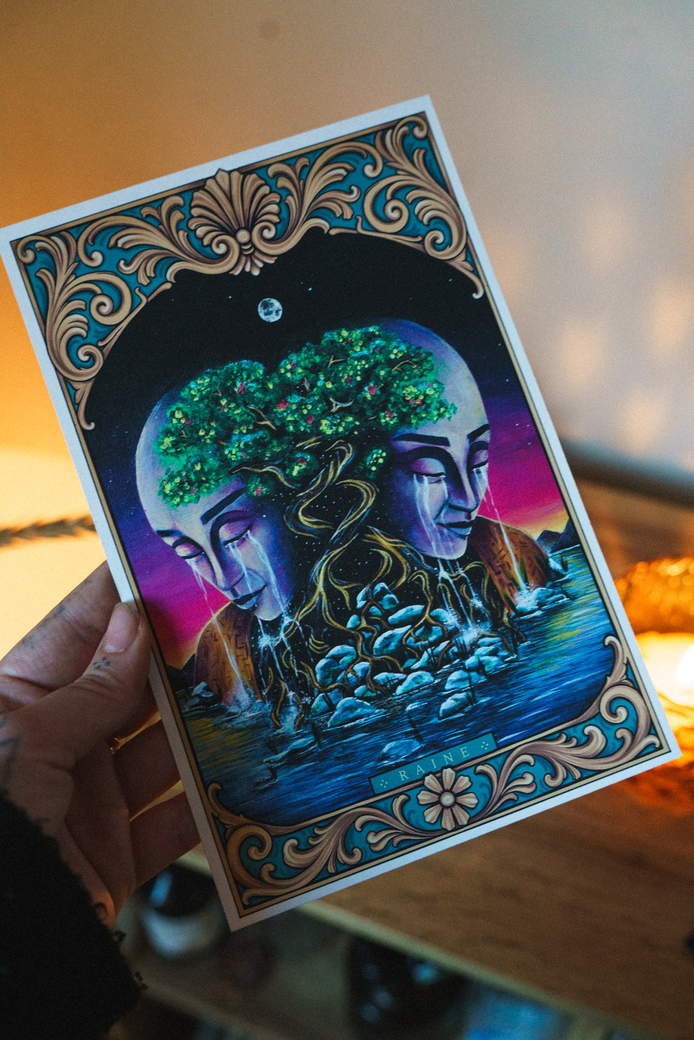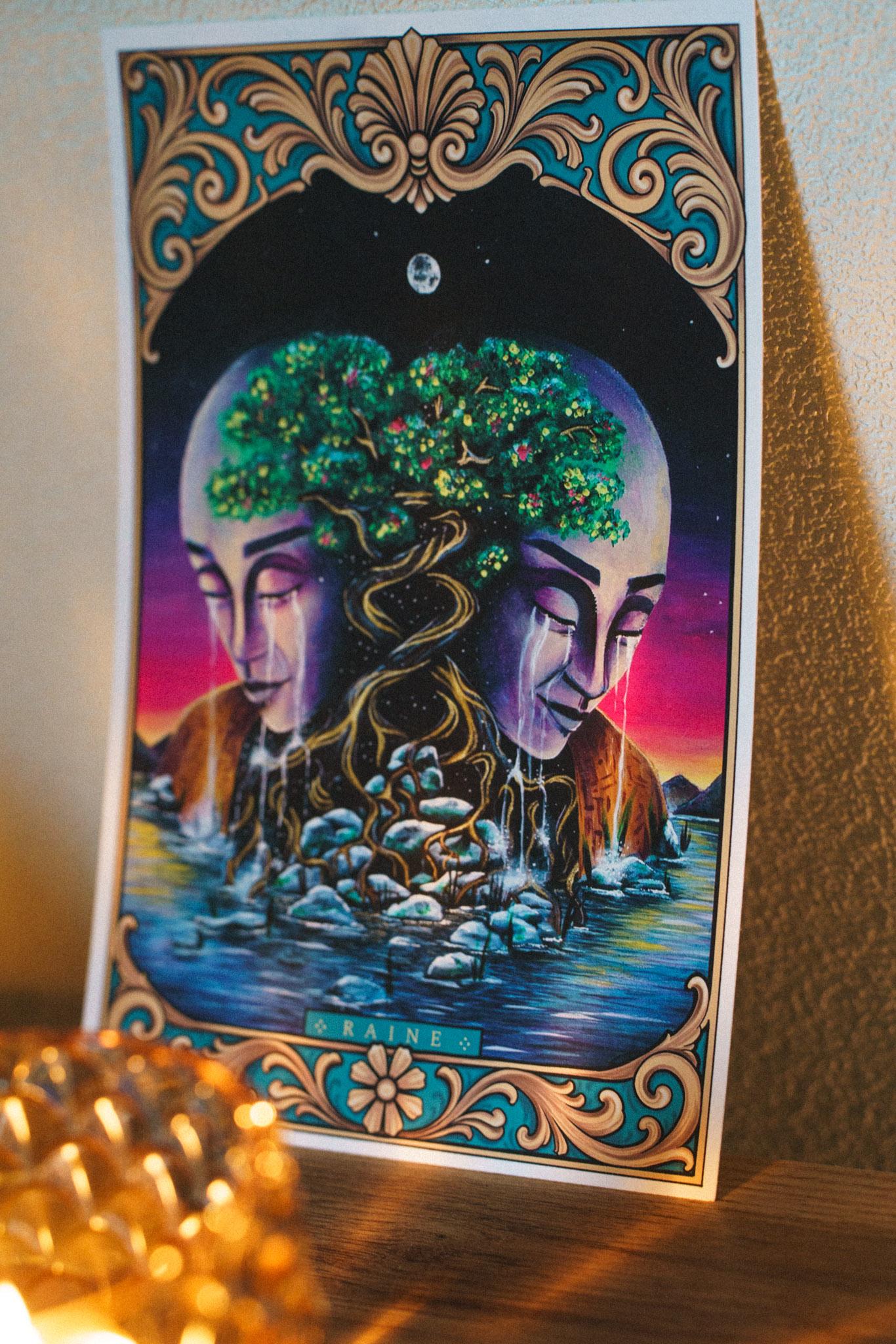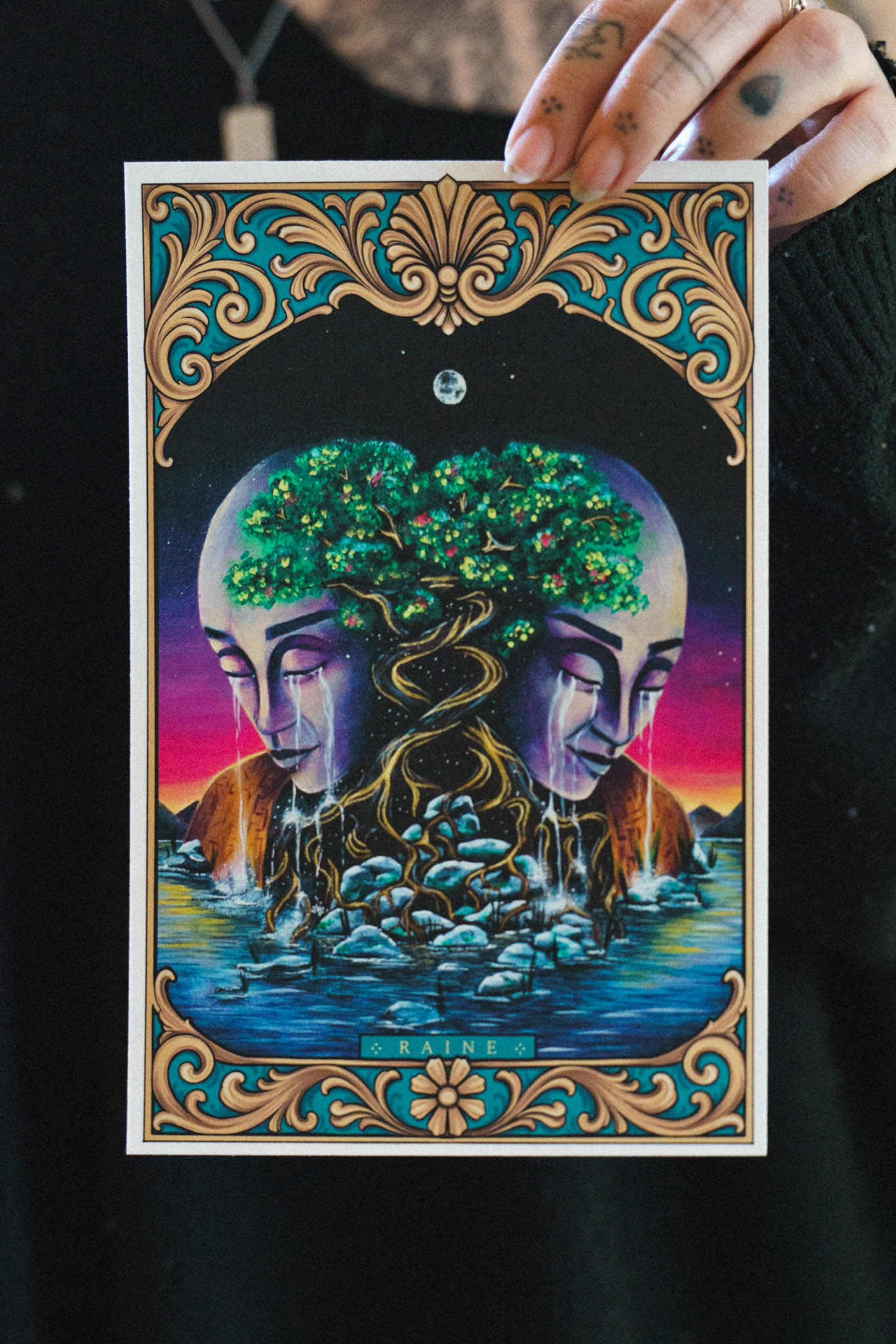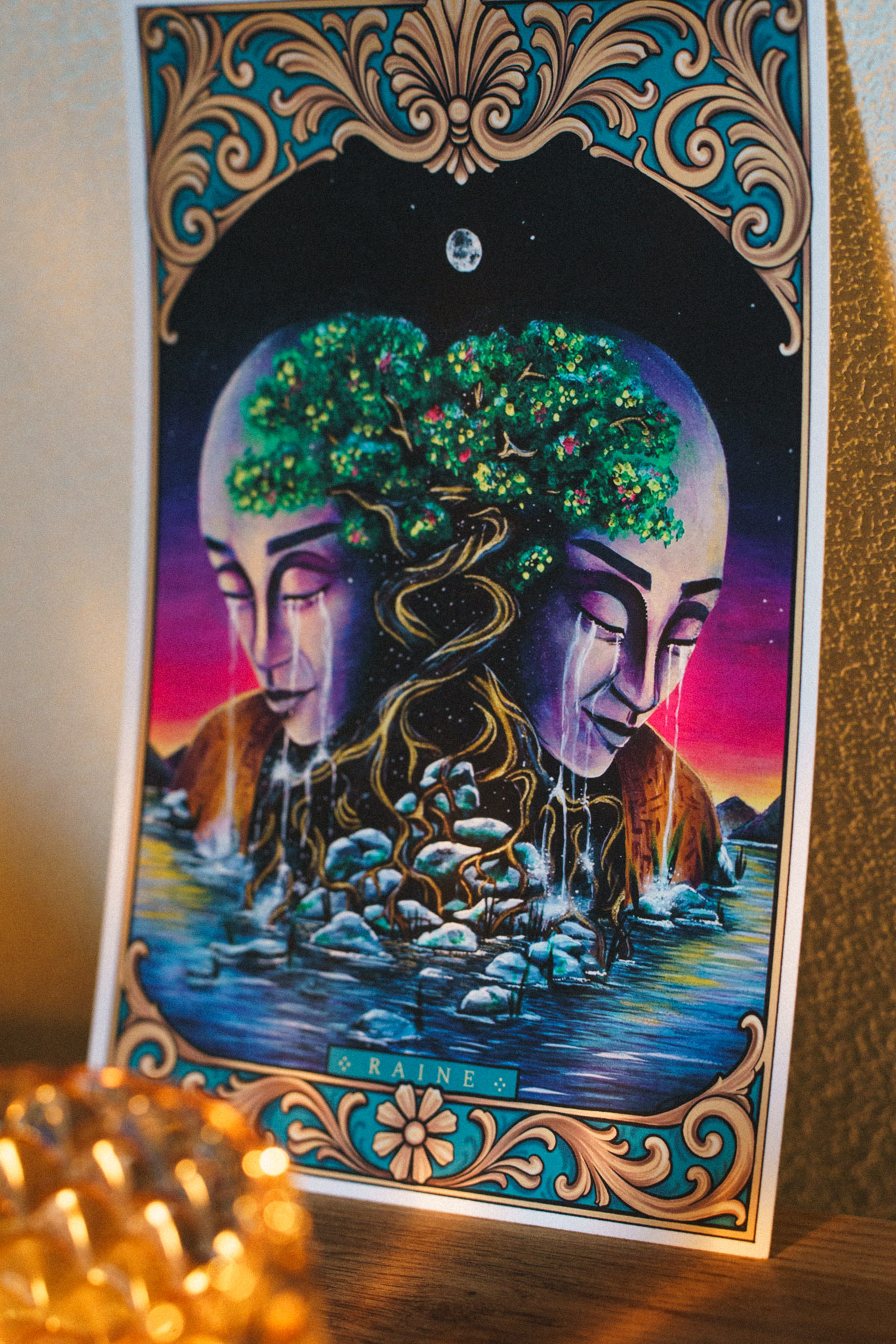 The Lovers is an A5 fine art illustration showing two mirrored faces carved like stone, crying rivers that flow into the same water below. Their heads blossom into a shared, ancient tree — roots intertwined, branches heavy with life, held beneath a moonlit sky and framed by ornate golden patterns.